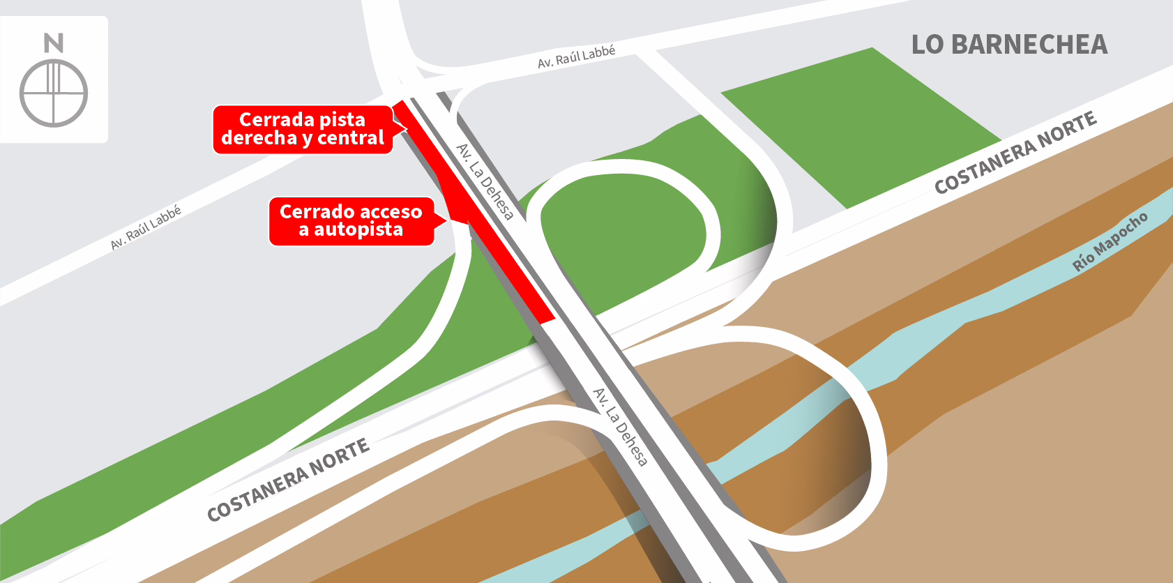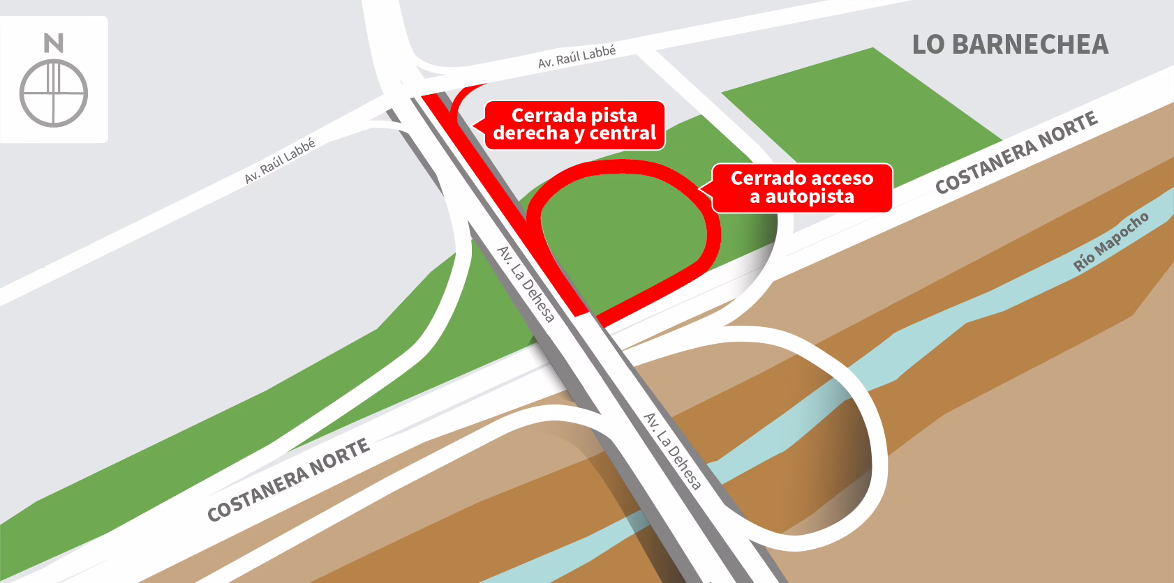 | Jueves 08-01-2026 | 22:30 a 06:00 horas | 1 | Enlace La Dehesa – Av. La Dehesa | Sur | Lo Barnechea | Cierre de pista derecha y central de Av. La Dehesa. Habilitada pista izquierda para tránsito de vehículos. Además, cierre de la entrada al poniente de Costanera Norte. La intersección de Av. La Dehesa con Av. Raúl Labbé tendrá retención parcial del tránsito. Mapa de trabajo → |